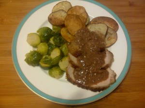While trying to figure out what to do for Sunday dinner I looked through a copy of my mother’s recipe books and found one for pork tenderloin with a mustard/port cream sauce. Didn’t have any tenderloins but I did have a 2-1/2 lb chunk of pork loin in the freezer. So I improvised. The original recipe called for roasting until the internal temp hit 155°F. Must have been an old recipe from some magazine when everyone overcooked pork beyond recognition where you needed a thick juicy sauce to moisturize the meat. I adjusted the temp down to reflect modern times where pinkish pork doesn’t scare us as much as it used to. Sunday dinner tonight was: mustard crusted pork loin with braised brussels sprouts and roasted potatoes.