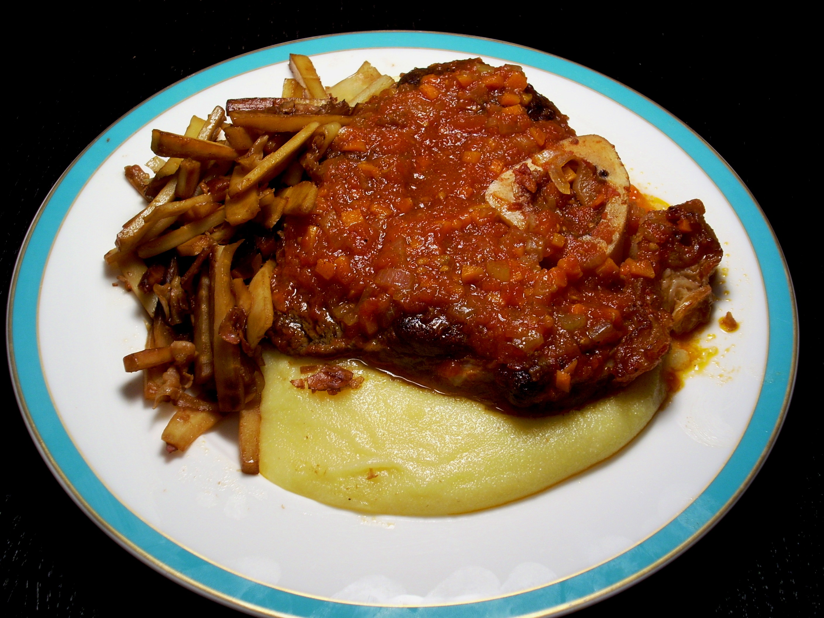 I used to like using whole lamb shanks, they were a pretty inexpensive cut, but lamb prices have definitely risen over the last couple years so I’ve been using beef shanks more. They’re cross cut like the veal osso buco pieces so they work just as well. You also get a lot more as beef shanks are bigger than veal. So, you get more meat, at a lower price, and use the same method bringing delicious results. No matter which meat you pick this recipe is great with a creamy polenta or risotto. A good combination for a decadent dinner that will surely become a favorite in the house!