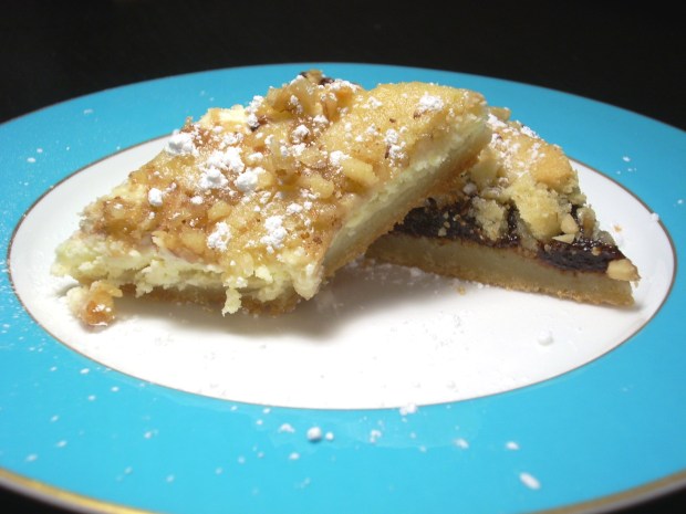 Remember how I said my Grandmother’s stuffing was one of the first recipes of hers I got? Well this is the very first one. Porlos testa (TEE-sta). Nothing says Christmas to me like these “cookies.” I suppose they’re more like a pastry but growing up they were my favorite, and still are. These were really special because they were only made at Christmas. Kinda like egg nog. And it seemed like everyone in her family made them. I’d get them at her house, at my great-aunt and uncle’s house where we had Sunday dinners, and at home because my mom learned how to make them. There’d be two kinds of these Hungarian treats. One would have a cheese topping and one would have a prune/plum lekvar topping. My mother’s transcribed recipe mentions apricots so I suppose that was also used but I don’t recall ever having any. The cheese ones are my favorite. They are extremely dense but delicious. When you cut them up, make sure you cut them into smallish pieces. They’ll keep for a while in the fridge and just like my grandmother’s stuffing these are also a great hit. Cheryl brought some to her office last year and the plate was empty in 15 minutes. Even though I prefer the cheese ones both are really good with a cup of coffee.