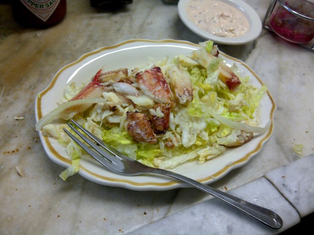 Next up was an order of their crab salad with a side of Louie sauce. Shredded lettuce topped with a few handfuls of crab. The crab was sweet and meaty and another hit with us. After that we each tried a bowl of their clam chowder. It’s a milk-based one (I’m a Manhattan style chowder guy, again the NYer in me) and was good. A little thin, and not enough potatoes or clams for my liking but it had really good flavor. You could tell it was clam chowder. Thinking back, to be honest I kind of like that it wasn’t a thick chowder; it’s supposed to be a soup, not a stew. We finished off with a prawn cocktail. When ordering I commented that we needed to have the one piece of seafood left we hadn’t tried yet and our fishmonger asked if we’d had the smoked salmon yet. I told him Cheryl didn’t like smoked salmon so we hadn’t ordered any. A minute later he reappeared with a slice of it on some bread for me to try. It was great! It had a deep smokiness to it, but was not overly salty or fishy. This is the kind of smoked salmon you wish you could have every Sunday morning on a bagel with some cream cheese, tomato, and red onion. Oh, so good.