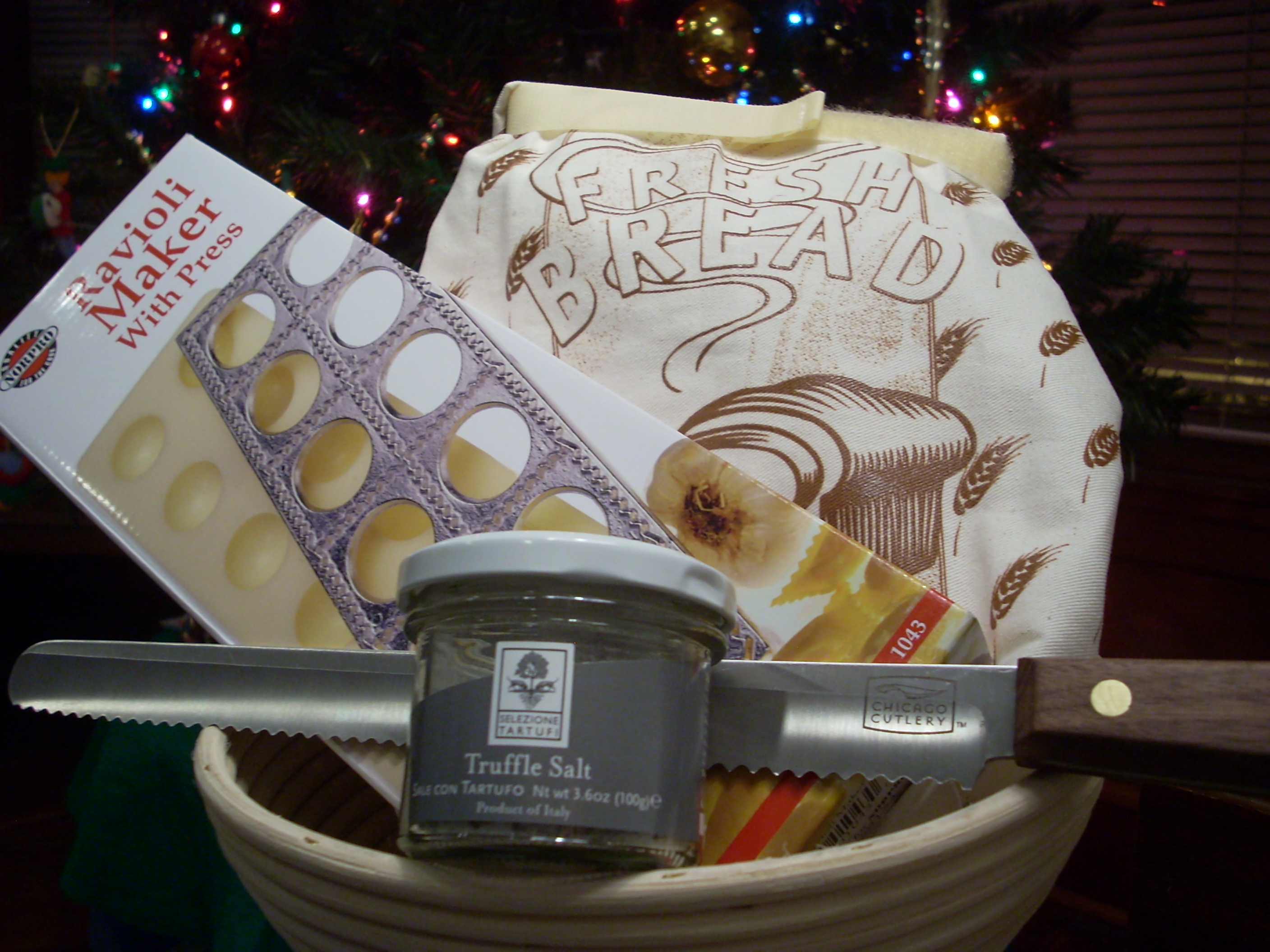 Anyway, Christmas has come and gone and I got some great kitchen stuff this year. There seemed to be a dough theme going on which was surprising since no one coordinated on it! Cheryl gave me the ravioli press and the bread bag, my mom gave me the brotform/banneton (and a potato ricer not pictured, gnocchi “dough”!), my dad sent the new bread knife, and the truffle salt came from my mother-in-law (remember, that is always on the wish list). I’m so excited to use these in the new year. Already using the bread bag and knife. That knife is great. I’ve been wanting a bigger bread knife for the large loaves and this one fits the bill perfectly.