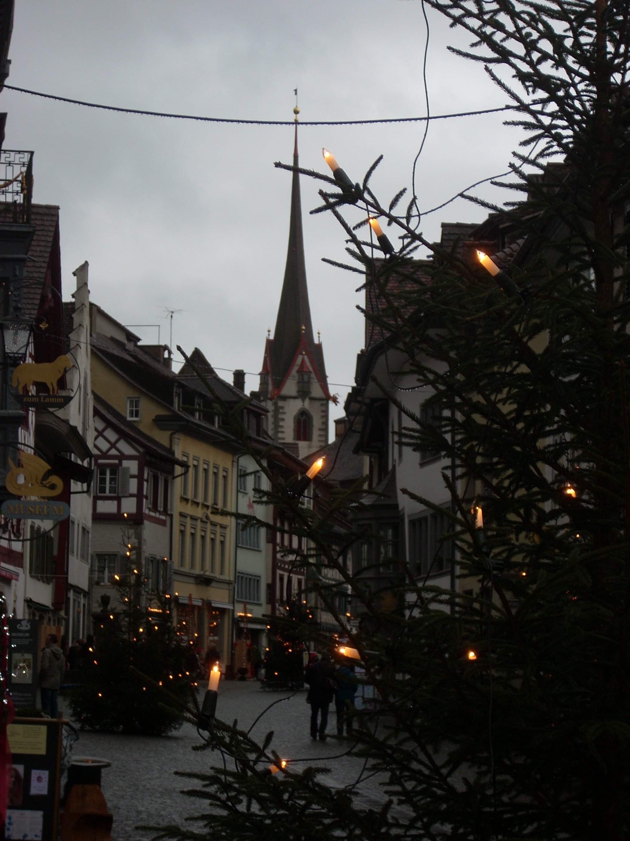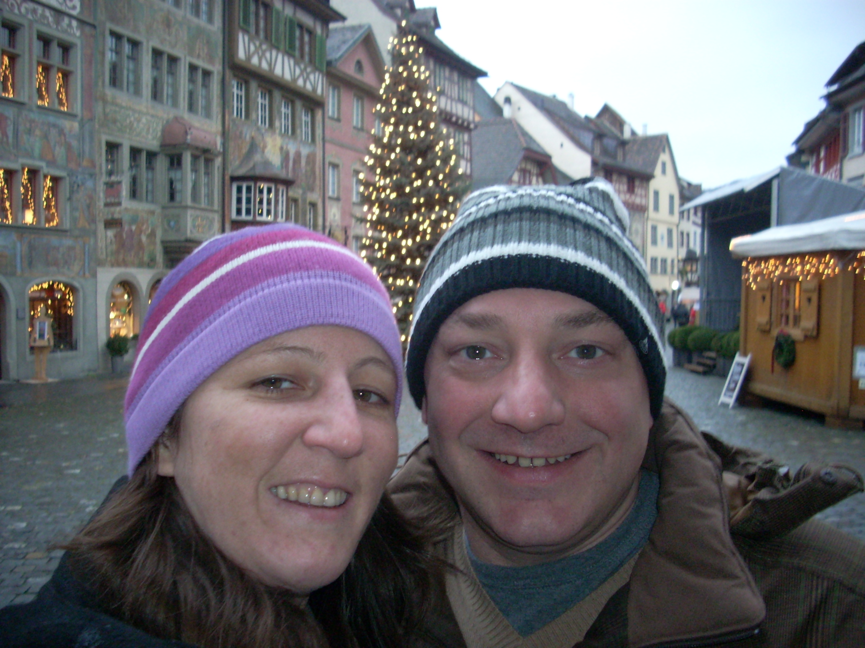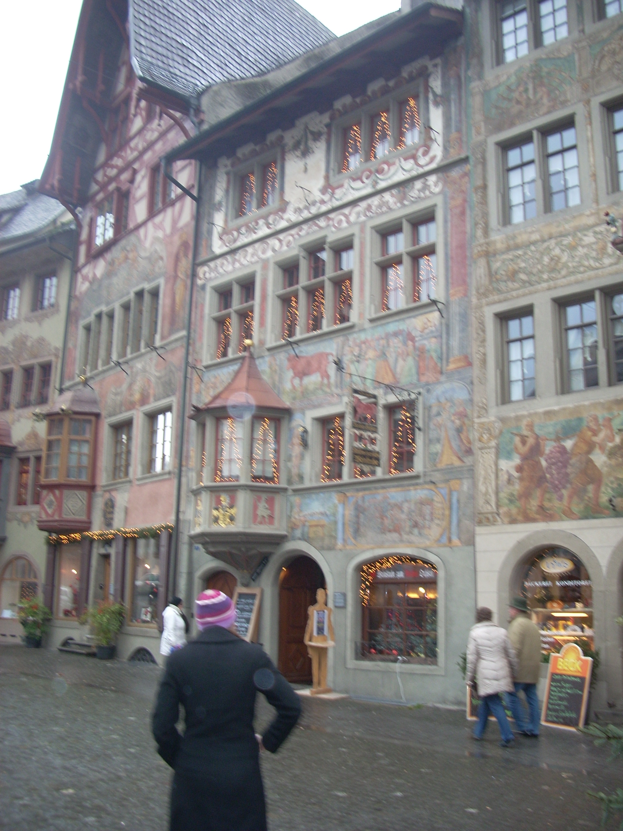 Saturday was rainy and overcast which meant it was good day to hop on a train. I continue to be impressed with the transit system there. Lots of trains and trams, and of course, they run on time. Anyway, it was rainy so we decided to go to Stein am Rhein, a picturesque little river village about an hour from Zurich famous for its preserved medieval city center. Supposedly a million people go there every year to do some sightseeing. Luckily for us, there were not that many people milling about the streets on New Year’s Eve Day. It’s a pretty cool village and I’ve never seen anything like it.