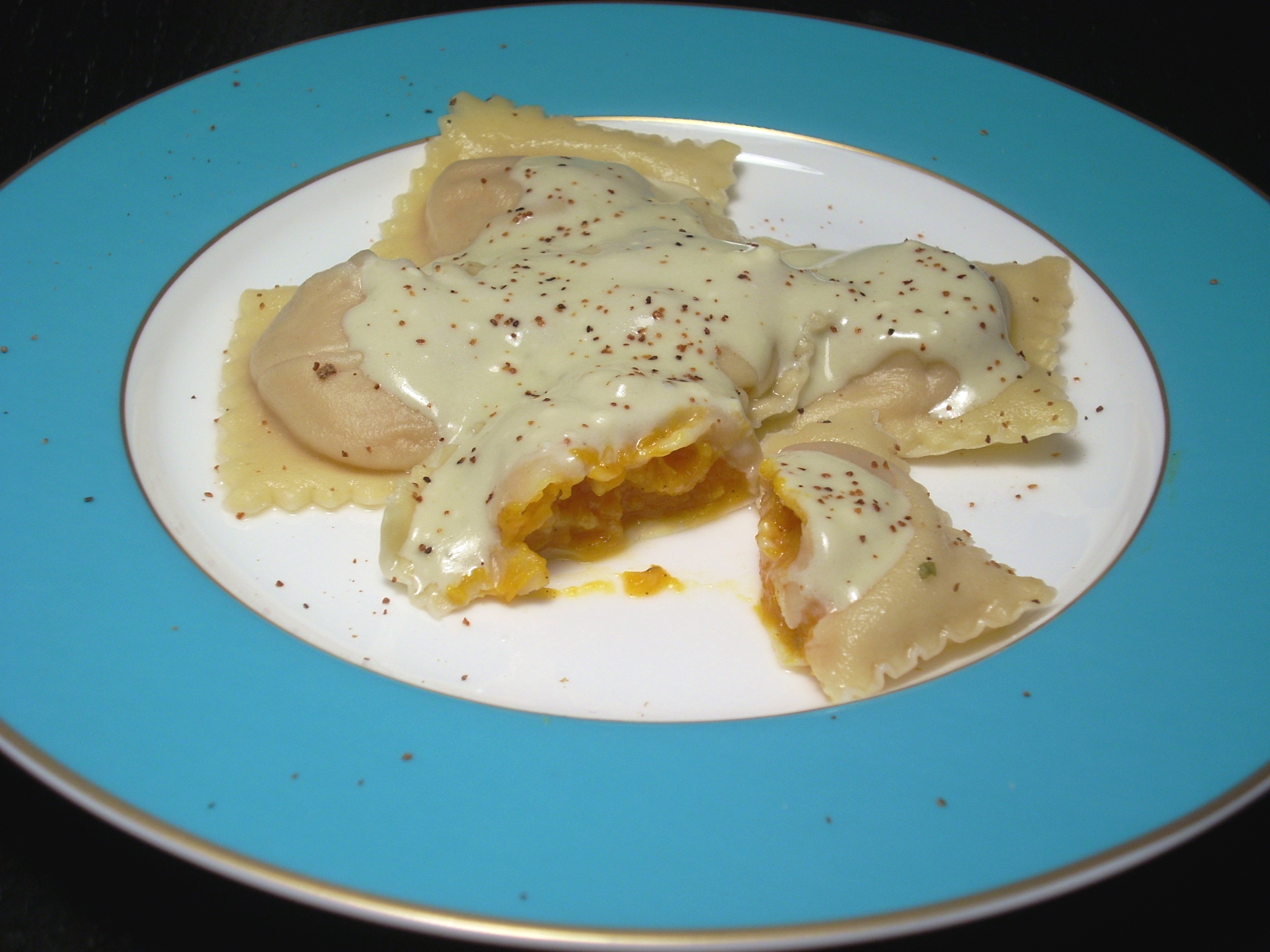 We were having our friends Erik and Jen over for dinner so I made the ravioli the day before and froze them (probably didn’t have to) in order to relax all day Sunday and watch some football. Also because I was nervous about my first foray into the realm of ravioli and wanted to leave plenty of time in case I had to fix anything or go to a plan C. I’ve gotten pretty good at making the pasta dough, it’s an easy 3:2 ratio of flour to eggs, so the tricky part for me was figuring out a filling. I wanted to make a simple one for my first go so I settled on using butternut squash. It’s pretty inexpensive and you can make a lot of filling with just two squash (squashes? squish?). Didn’t want to waste any cheese if I happened to mess up. Then I had to decide on a sauce. Could’ve gone with a brown butter/sage sauce but instead I opted to make a creamy gorgonzola sauce. I thought the salty, sharp cheese would go well with the sweet squash filling. It’s a pretty classic, no-brainer pairing which turned out to be a good choice.
