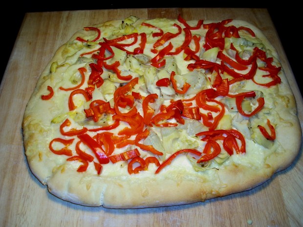 Put cheese, artichokes, and peppers on top of pizza dough. Place back in the oven (you didn’t shut it off did you?) and bake for another 10 mins. Remove, grind some pepper on top, cut, and eat!