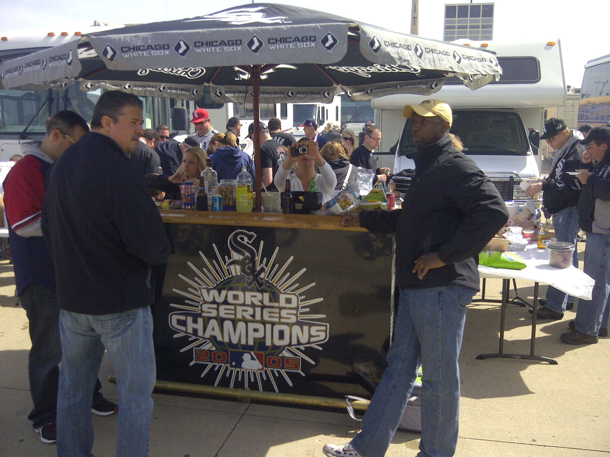 My friend Erik is a big Sox fan and he kept telling me the Sox home opener is really fun, and since this year it also fell on his birthday it’d be doubly fun. One thing I’ll say about Midwesterners is they’ll tailgate for anything and they don’t do it half-assed. Wouldn’t be surprised to see an RV, a grill, and tent at a Walgreen’s grand opening. Now, I’d never seen tailgating like this at a Yankee game (or Mets game either). There, we’d just show up, grab a hot dog outside the Stadium and go to Stan’s across from the bleachers under the subway for some pre-game beers (at old Stadium that is, haven’t been to the new one yet). I’d also never been to a home opener in all my years of attending baseball games so this was going to be special.