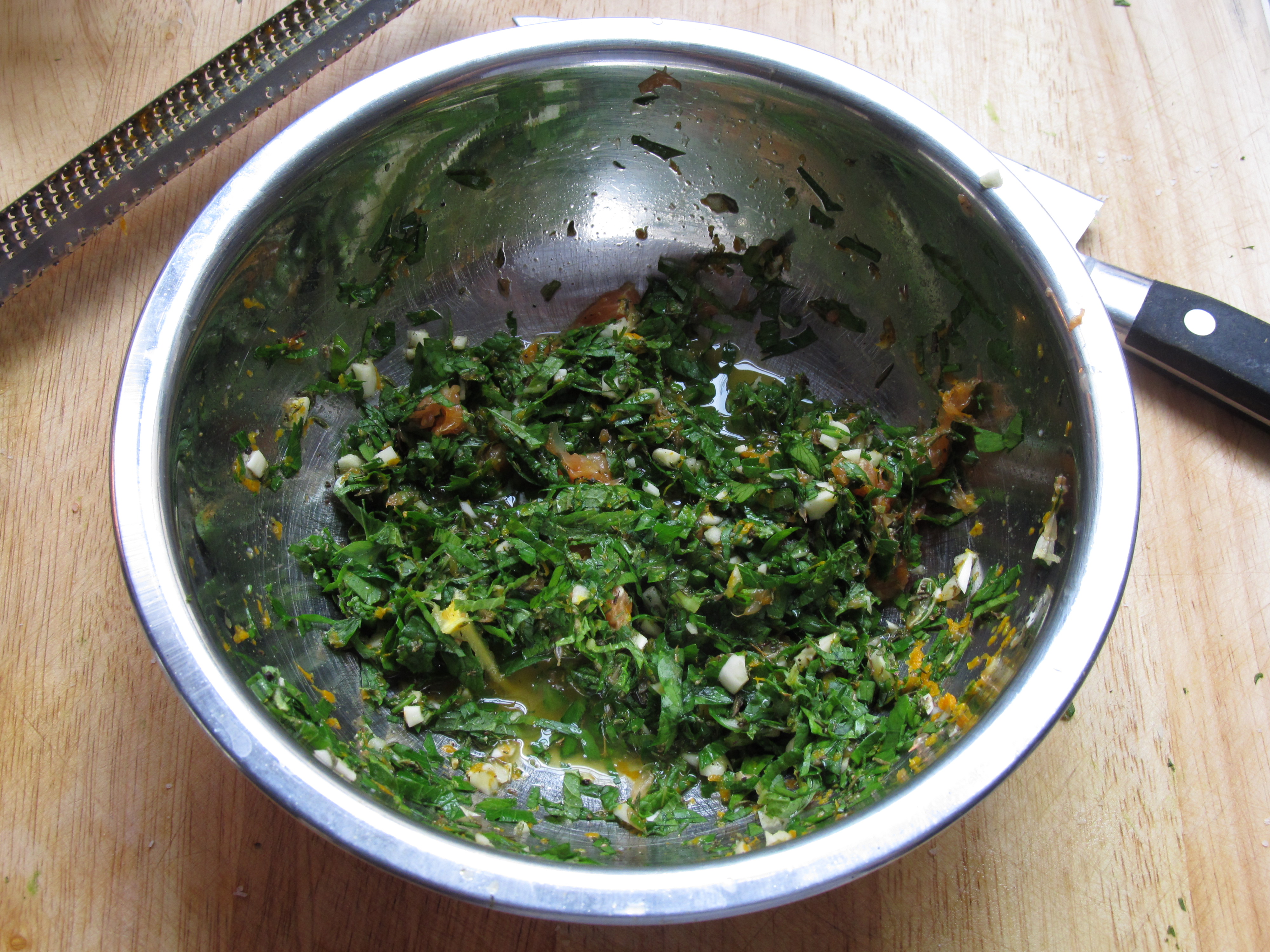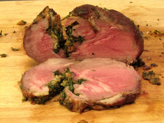 Lamb has always been pretty popular with my family, on all sides actually.  My mom always says roast leg of lamb was my grandfather’s favorite dinner.  My step-mom loved it too.  Lucky for me everyone will eat it but also unlucky for me everyone likes it.  Not many leftovers!  Normally I just get a whole 6-7 lb leg and roast it but since I just had a small one I figured I’d just de-bone, stuff with some herbs and roll it up.  De-boning can be pretty easy if you have a sharp knife and just work your way along the bone.  Cut and scrape, pop the bone out, spread the mixture on the inside, roll up and tie.  You can also buy one that’s already been boned if you’re unsure of your knife skills. The nice thing about such a smaller piece of lamb is it cooks pretty quickly in the oven.  This one took about an hour to get to 135°F on the thermometer and came out so juicy and tender.  I let it rest while grilling some vegetables and making a sauce.