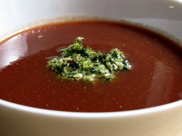 This dish is definitely an “add what you think is an appropriate amount” type of recipe. I’m looking at the recipe sheet from the class and there aren’t any amounts for the parsley or balsamic. Add what you’re comfortable with. With the parsley, I add enough so it’s about equal to or maybe a little less than the nuts, about 4 sprigs/shoots, enough so when you hold them in your hand all bunched together the bunch of leaves cover your fist. When mixing in the balsamic vinegar you have to keep adding and tasting until you hit the right balance where you pick up the sweetness of the vinegar but not too much to overpower the tomatoes. Just add some, taste, add some more, taste. I apologize for this but the best way to describe it is the soup needs to have that “tang” to it. It’s going to have a deep red color when it reaches this point. Because it’s an add to taste recipe you can make large or small quantities pretty easily. Top it with the “pesto” and some cheese. The class recipe calls for some allioli (aioli) but I can never seem to find any here. If you can find some use it! I remember it being great with this soup.
