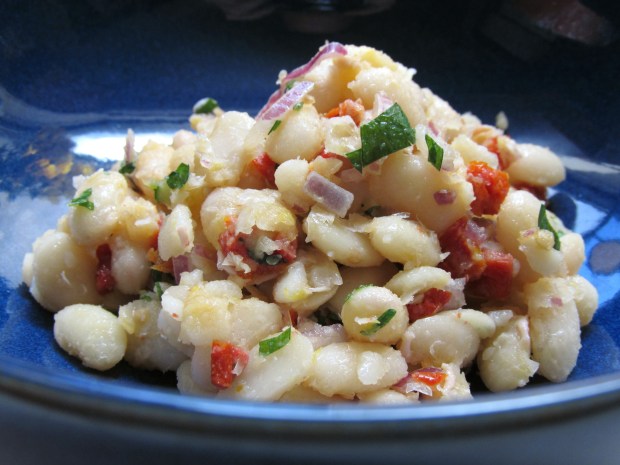 I warned you there’d be more than a few cold salads during the summer. This is one I’ve been cultivating for a few years and it’s getting very near perfect (for me at least). Many different kinds of bean salads can be found on picnic tables throughout the summer; sweet ones, vinegary ones, baked beans (ok that might be stretch but a big crock of cold baked beans at a summertime BBQ is delicious). This white bean salad is a snap to make and is one of those rare dishes that is even better a day or two later after the flavors meld together.