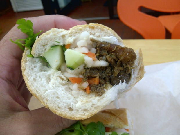 Ok, so what’s a Bánh Mi? A fluffy, light mini French baguette stuffed with some sort of meat (or tofu), pickled vegetables, cilantro, cucumbers, and maybe some jalapeno. Crunchy, tangy, spicy. Great combination and flavor for a sandwich. At Nhu Lan it’ll cost you less than $4.00. I usually get the grilled pork with everything which costs $3.95. That’s 3 dollars and 95 cents for the sandwich pictured above. Oh, and they make them fresh while you wait. Can’t beat that.