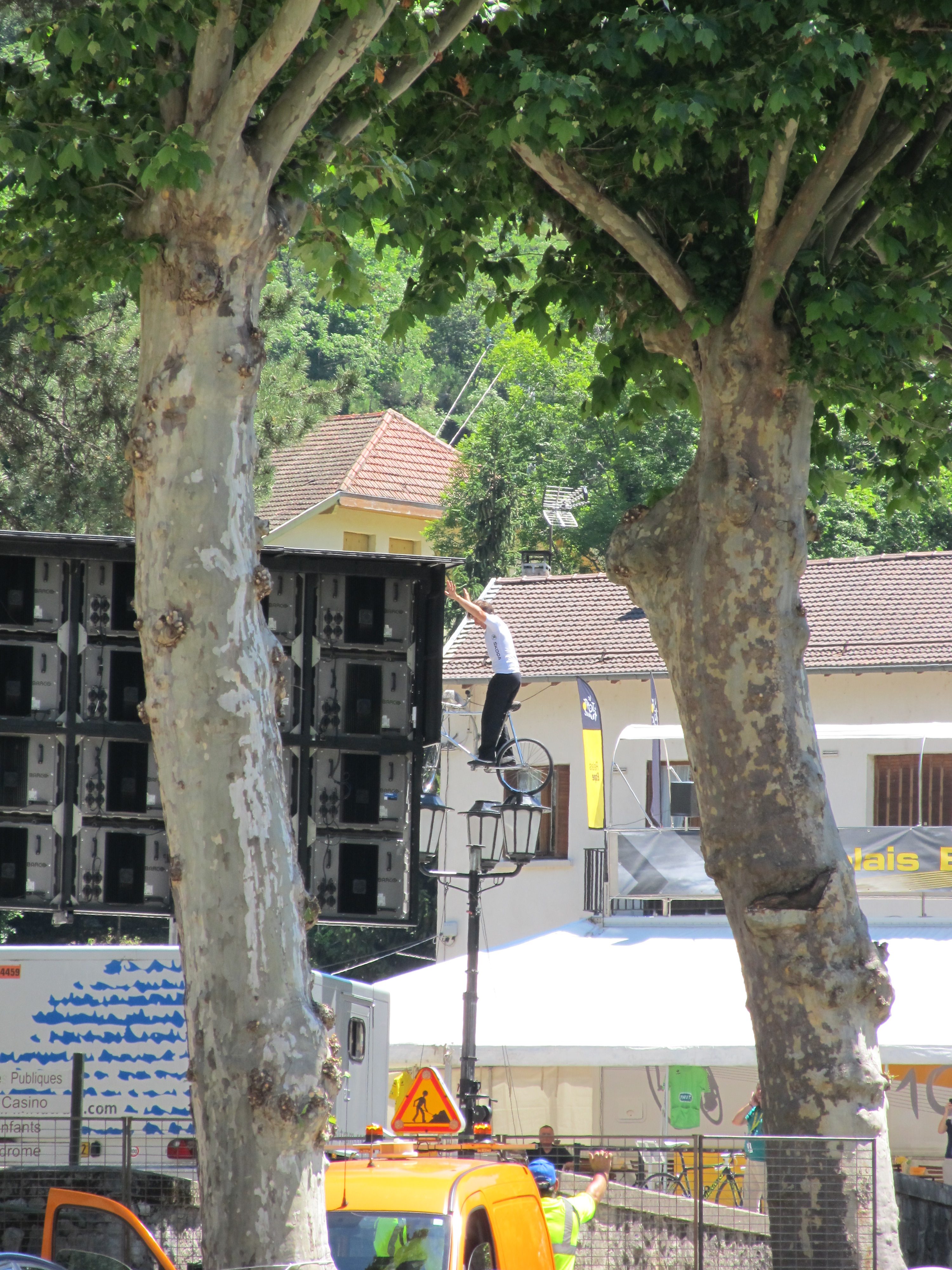 Some dude on a bike on top of a lamp-post. Yup we have the right town.