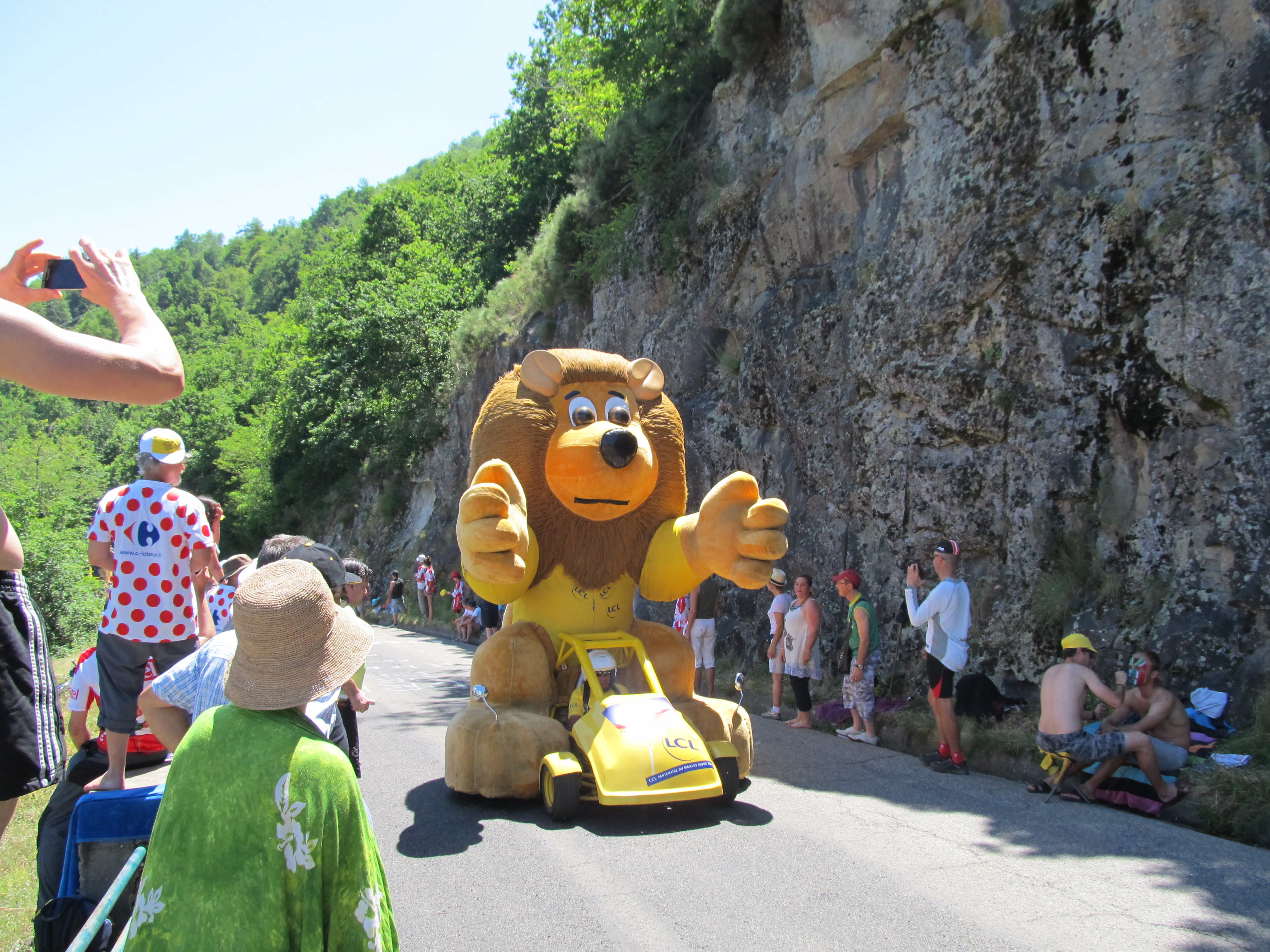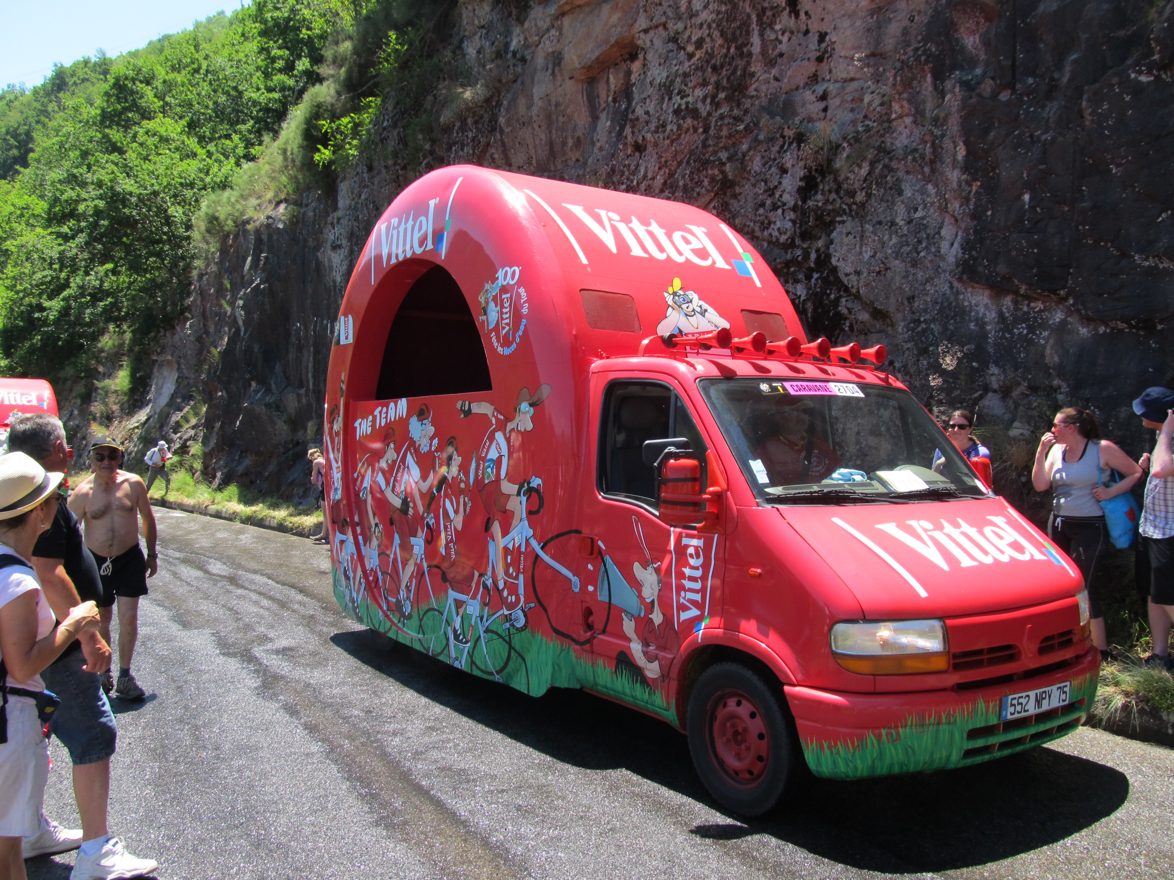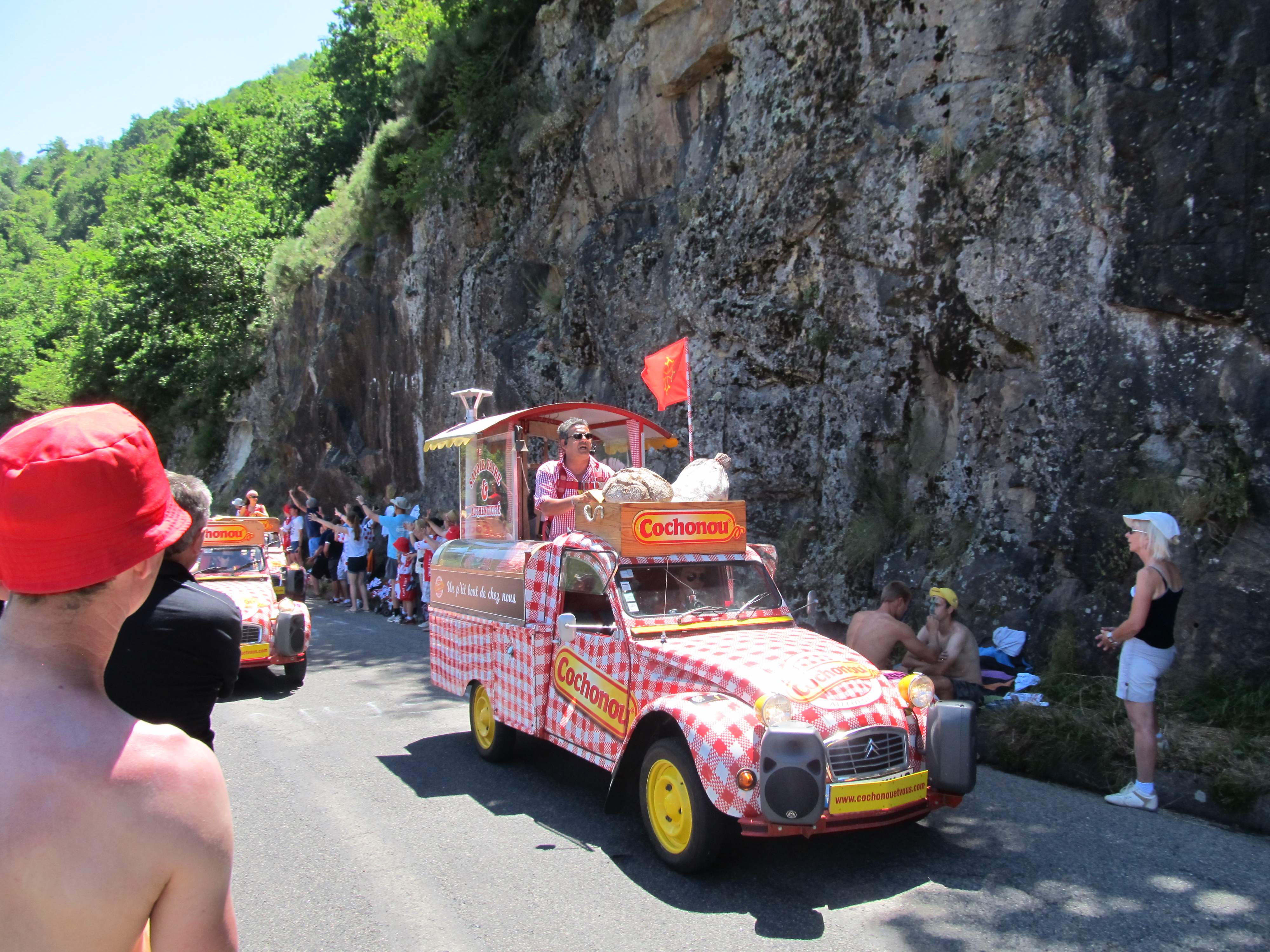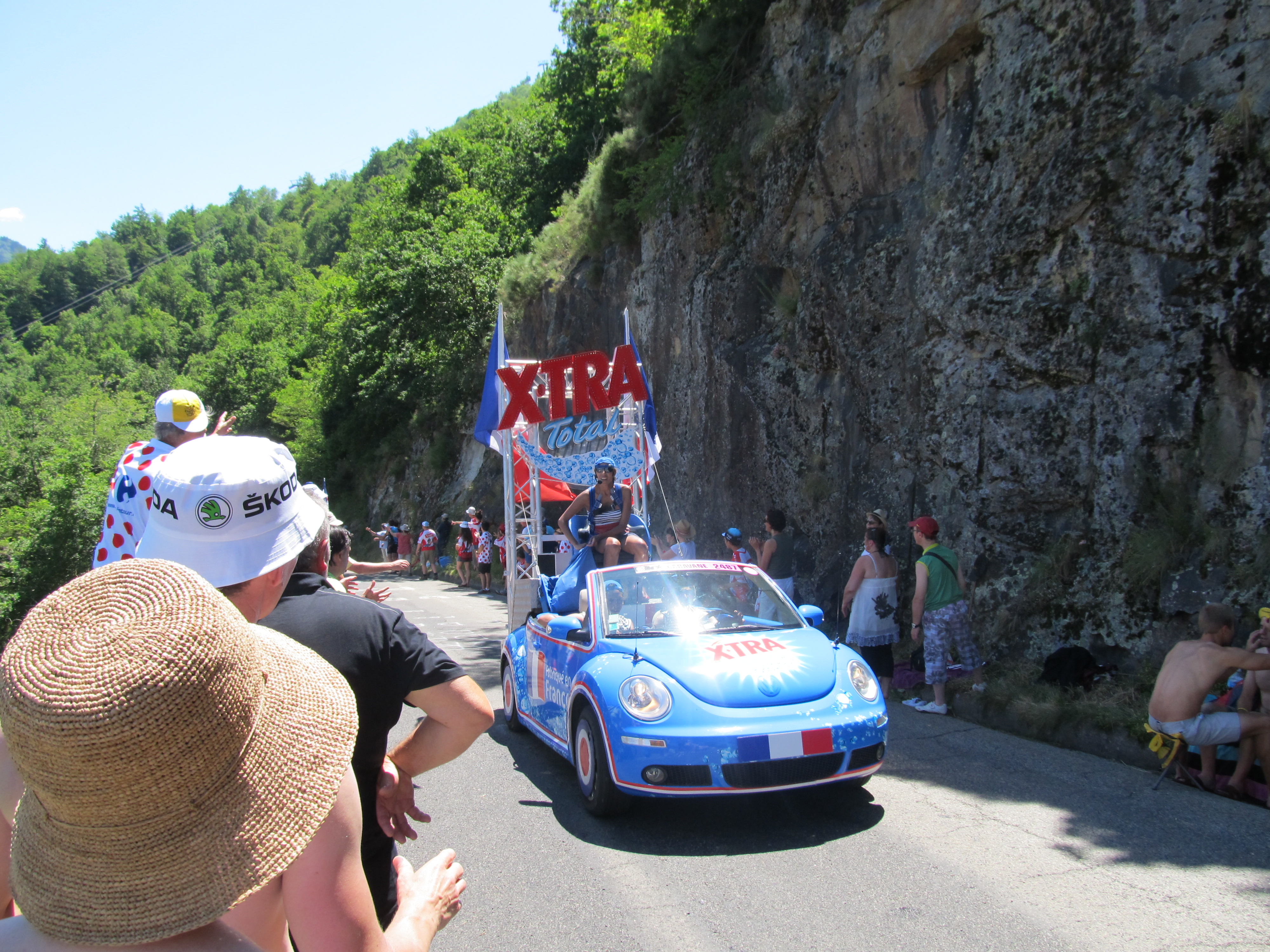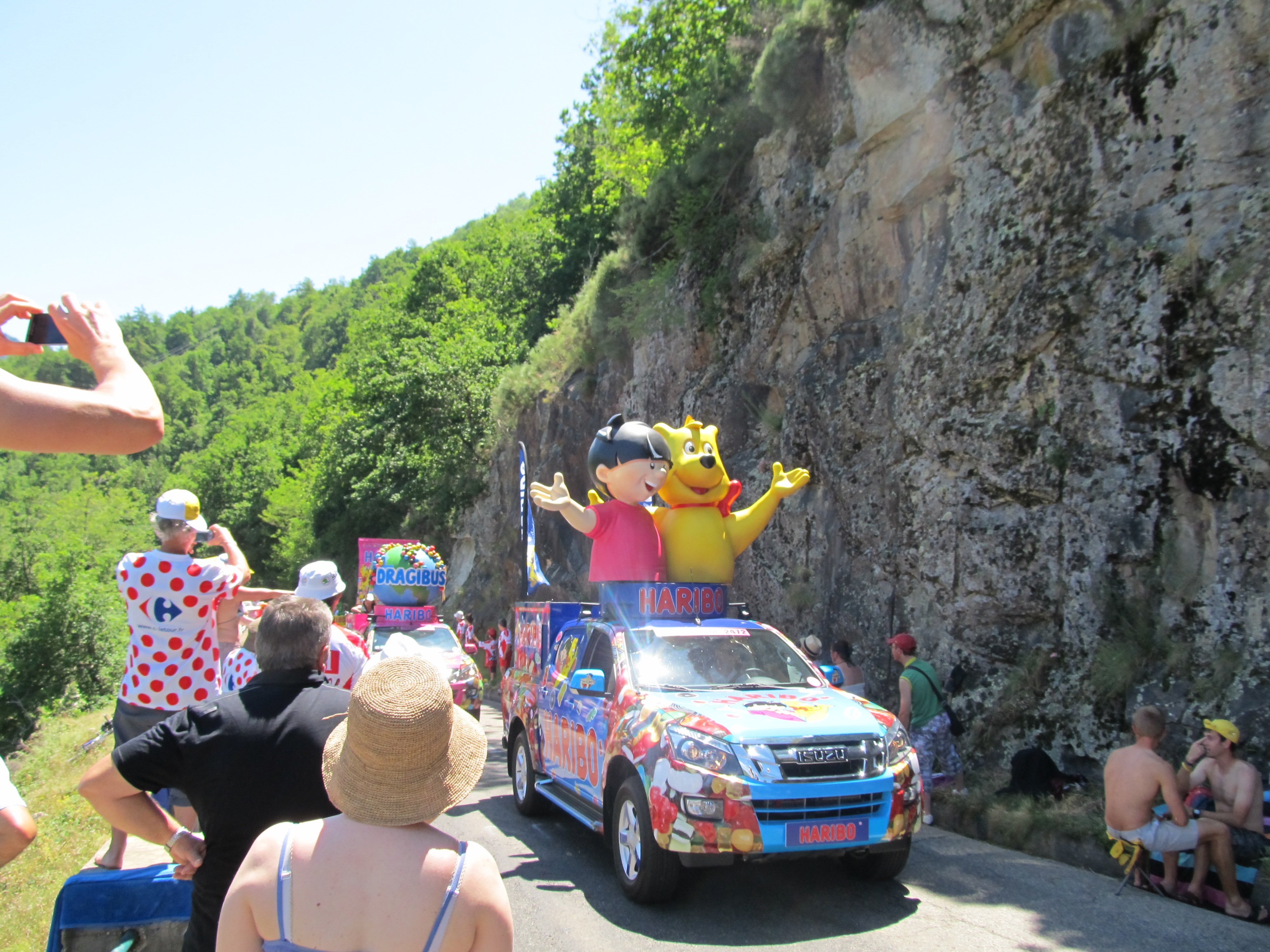 Now, there is a lot of waiting around on the mountain so the Tour de France entertains everyone with a caravan of sorts of all the Tour sponsors.  (Minor rant here.  After witnessing this I cannot ever see the Tour really trying to rid itself of the doping and drugs.  There’s way too much money involved in the advertising and sponsorships, as you’ll see…)  The beginning of the caravan precedes the riders by about two hours and the entire train of floats, cars, etc. lasts about an hour, so you have approximately 60 minutes or so of waiting once the caravan ends until the real show arrives.