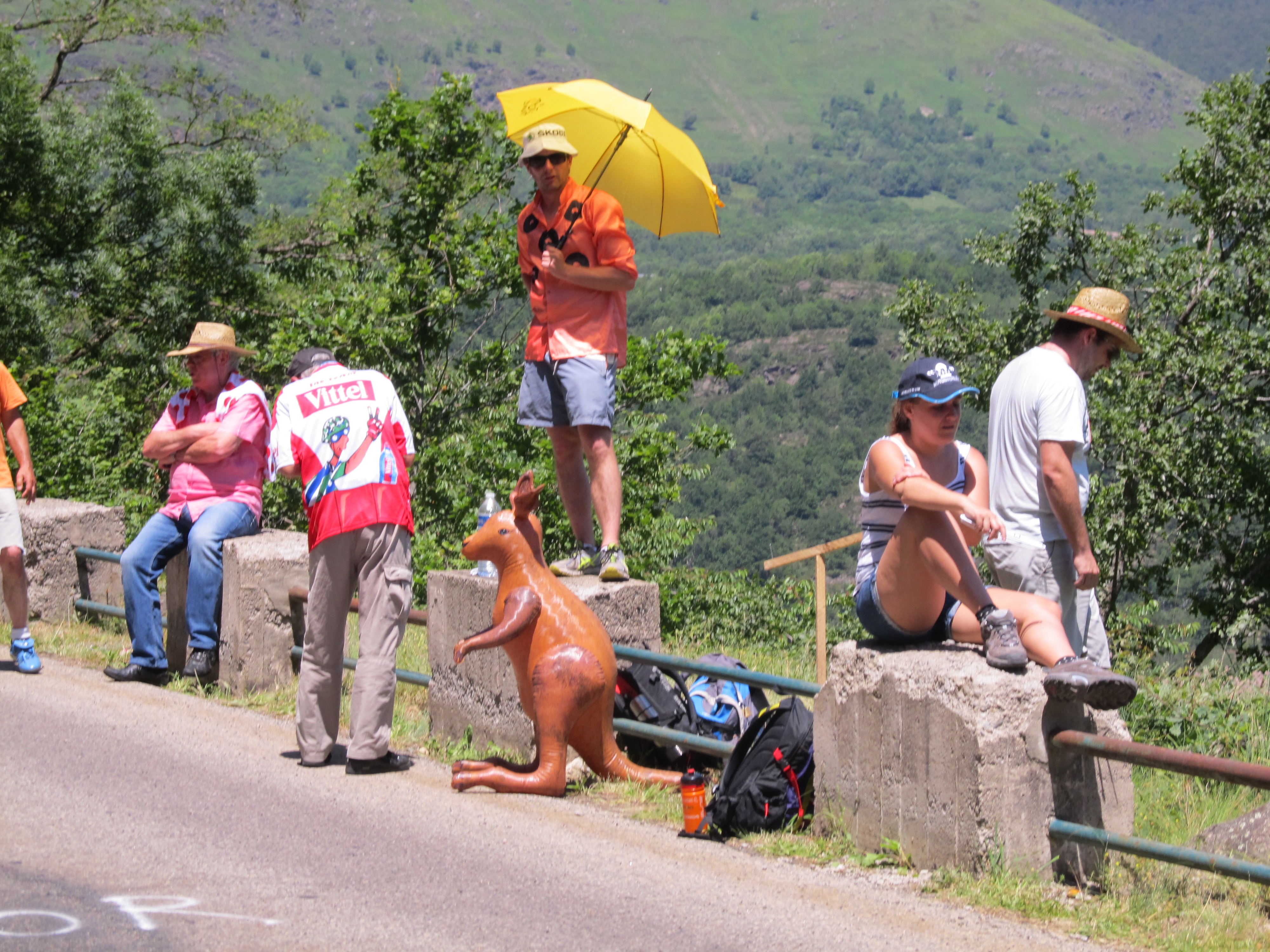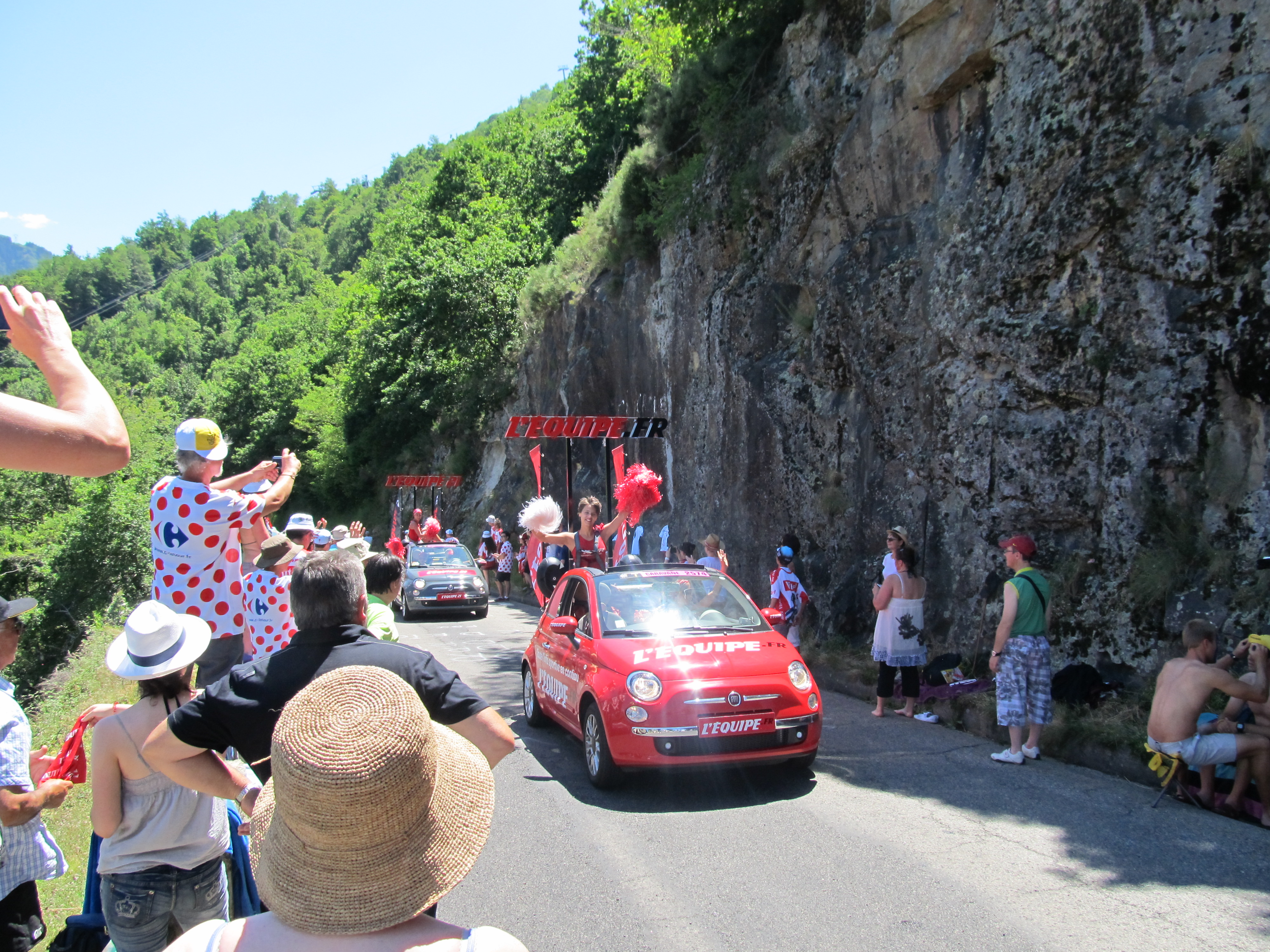 People go nuts over the caravan and the free stuff they give away.  If you’ve watched the Tour on TV you always see a lot of people in those red polka dot jerseys signifying the “King of the Mountains” jersey.  It’s similar to the Maillot Jaune (Yellow Jersey) the overall leader gets to wear but it’s just for the rider who has been the best climber in the mountains (points are awarded for order of riders going over the summit).  Anyway, the fans haven’t bought these special jerseys in town on race day, the jerseys are thrown out the windows of one of the sponsor cars (Carrefour in this case).  These are, of course, highly coveted and there is diving along the road for them.  We didn’t get any.  We did get some polka dot cycling caps.  Not the same though.