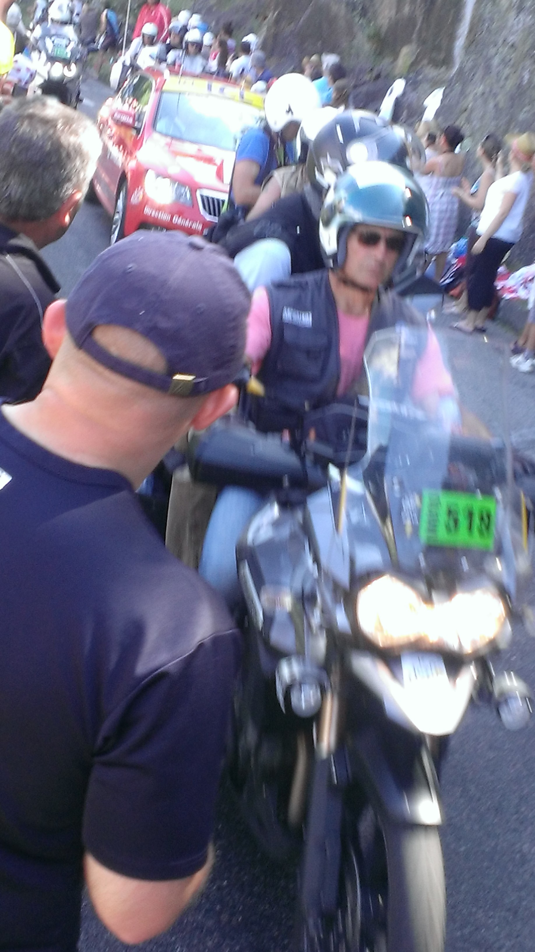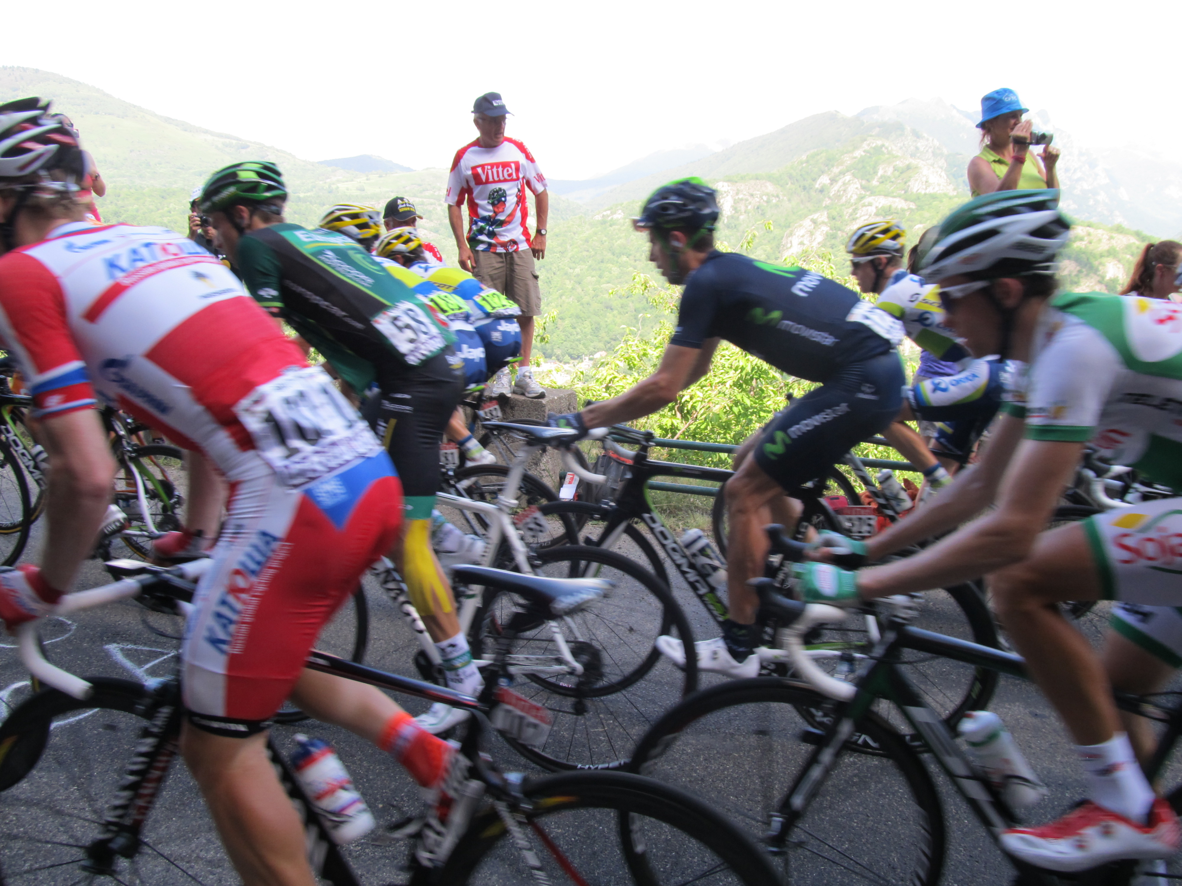 IMG_1786Had to wait a while for the Tour leader to appear in the Yellow Jersey.  Since all the previous stages were flat, it was worn by a sprinter.  Sprinters don’t do well in the mountains.