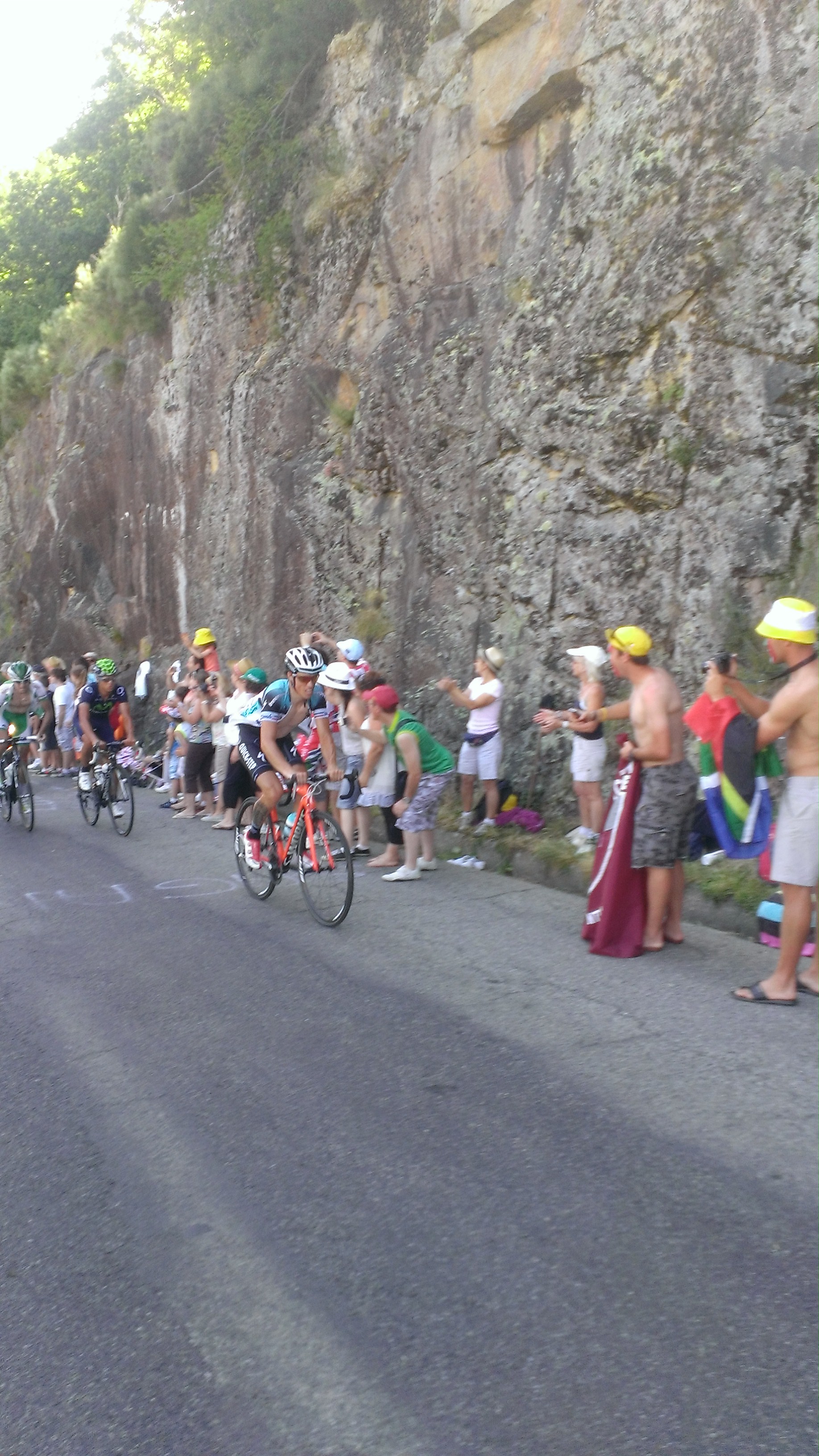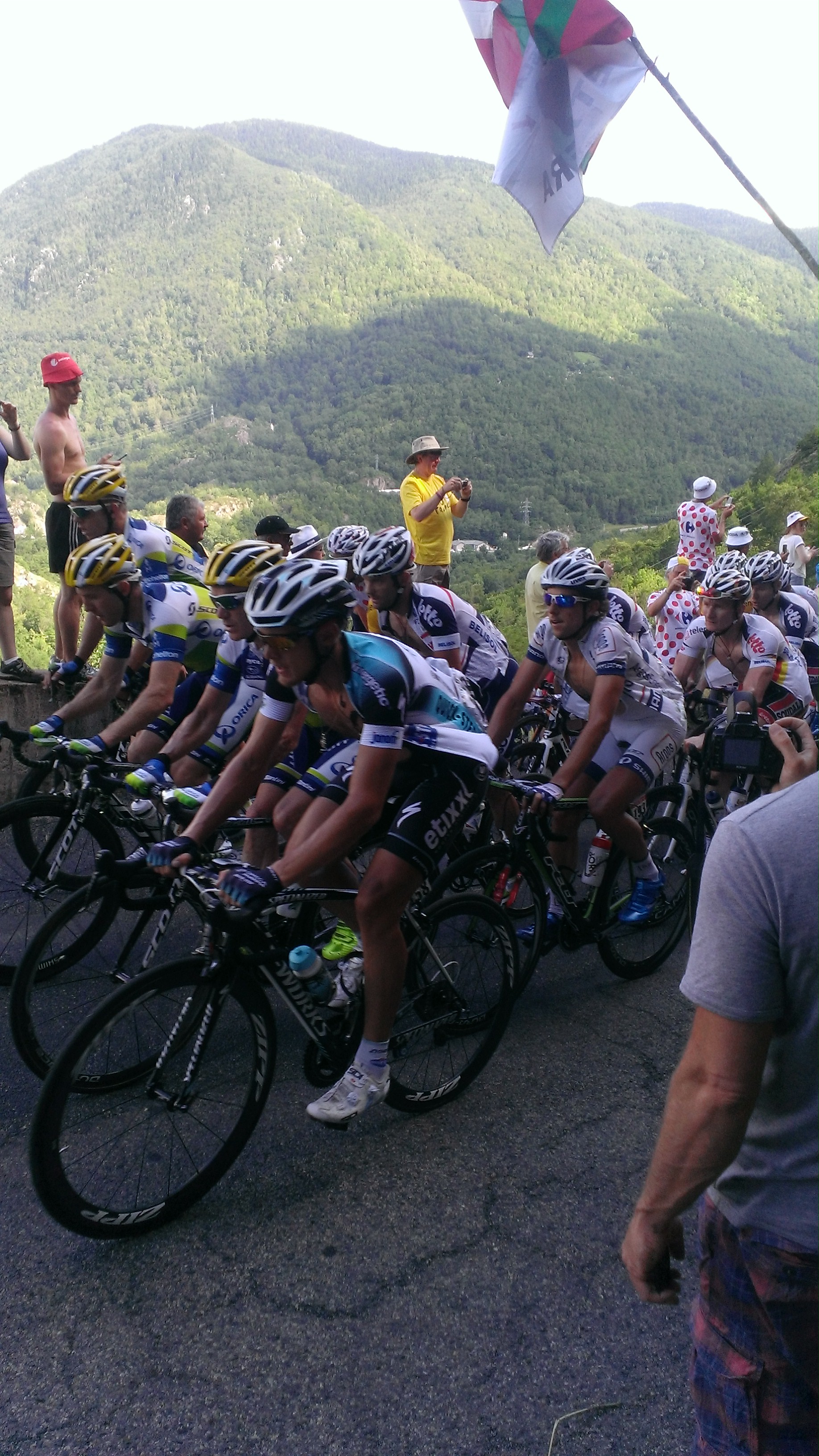 WP_20130706_080After the last rider went up and the Broom Wagon went by (a van which collects riders who quit or abandon the race) we started back down the mountain to our car.  This is where a really cool thing happened.  Since the finish was at the top of a mountain at a ski resort everything which went up had to come back down.  A lot of the riders just rode back down to their team buses, so all of a sudden you’d have the racers whizzing by.  First one I saw zoom by was Alberto Contador.  It was like being in the tunnel to the locker room.  The kids walking down really loved it and kept right on cheering the riders.