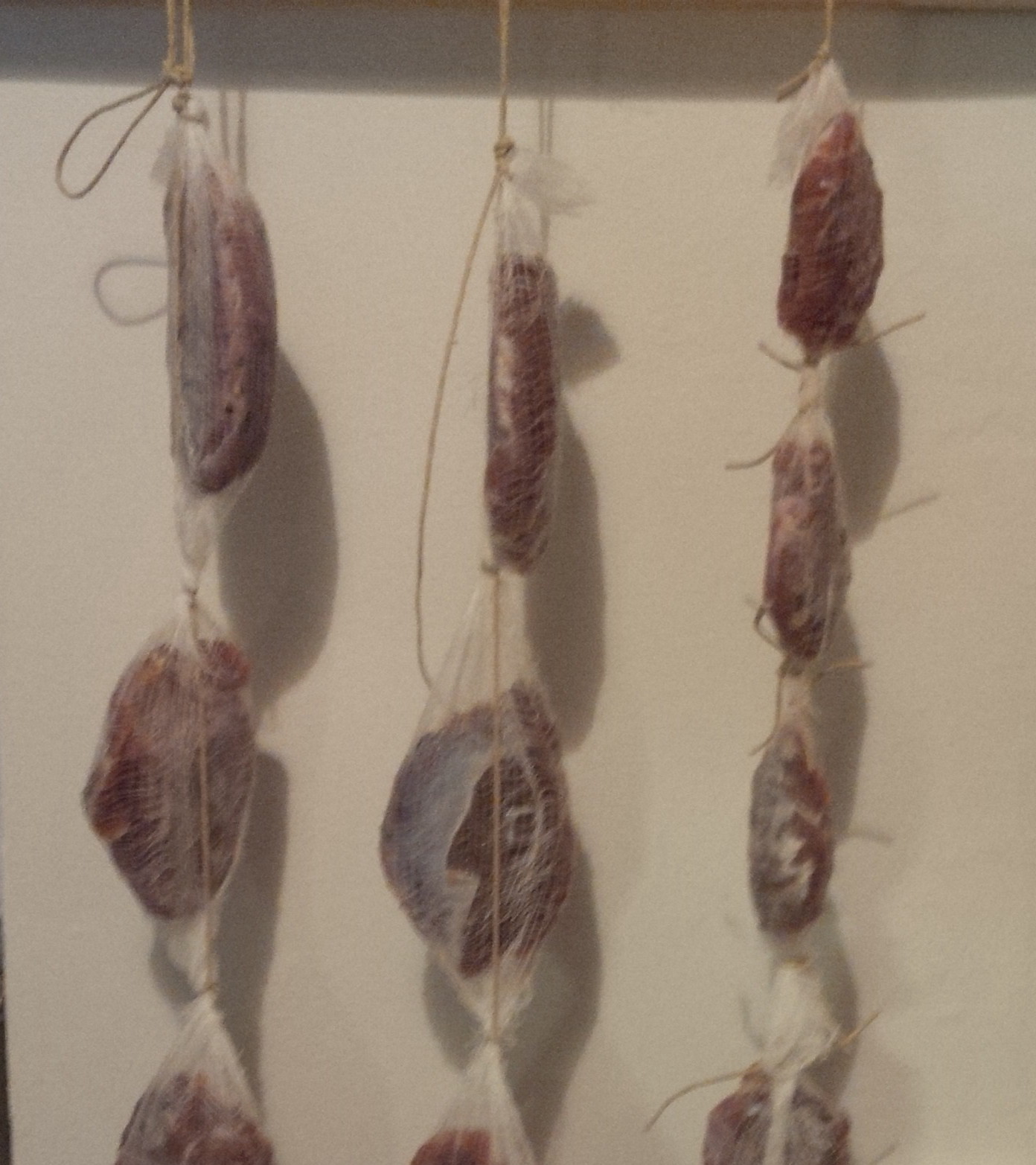 To be honest, I figured I’d be making this post a few weeks from now but since I was using smaller chunks the curing and drying was finished way ahead of time.  Depending on the size of the cheek it can take 1-3 weeks of hanging for it to properly cure.  I had a dozen pieces which added up to the total weight of the cheek I was supposed to have (2 ½ lbs) so I figured it’d be between 1-2 weeks.  Nope.  Not even close.  The really small pieces were done after 4-5 days of hang time.  The big ones were about a week.