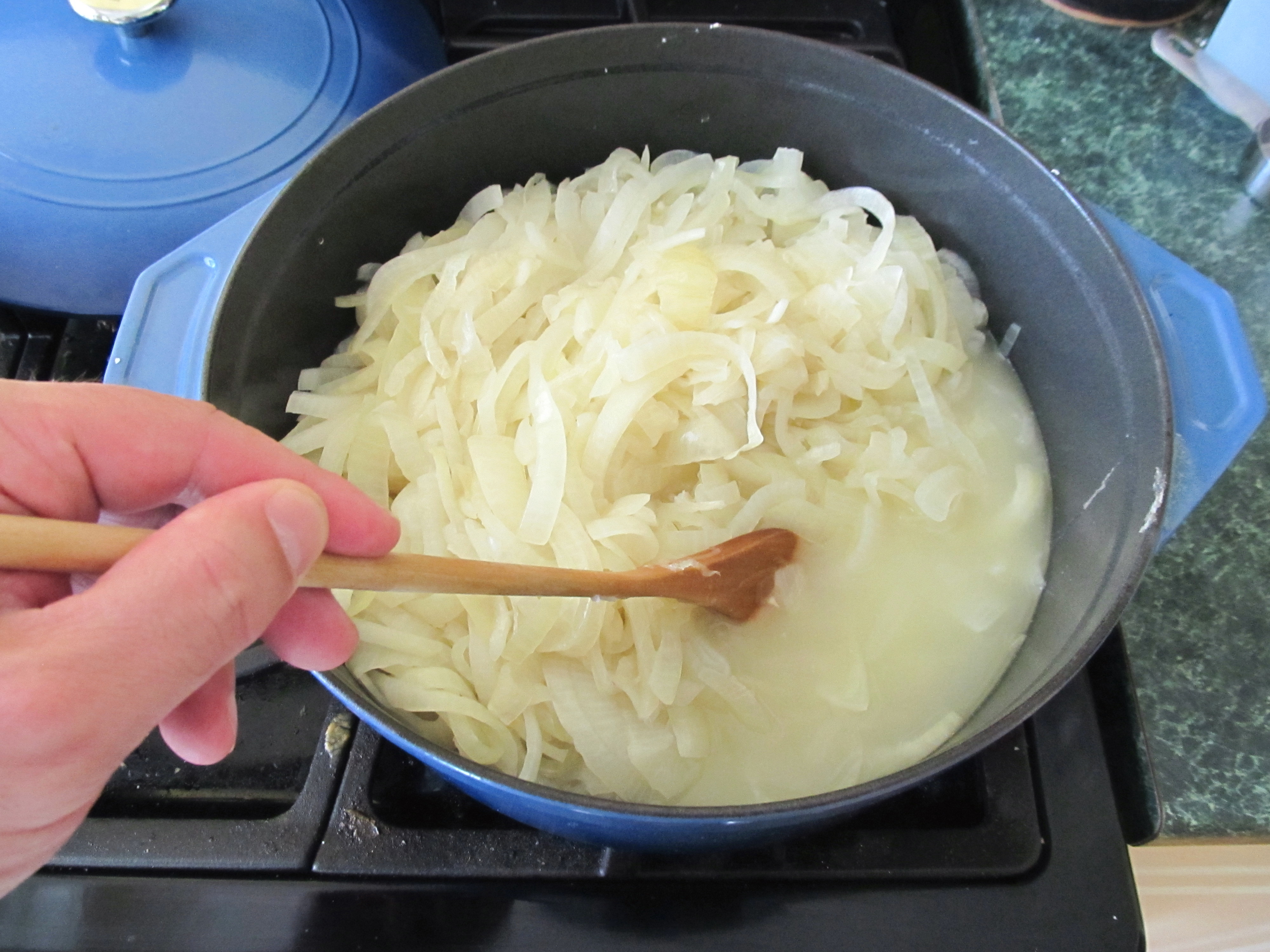 When the liquid has cooked off and the onions have reached a nice brown color add the water and bring to a boil.