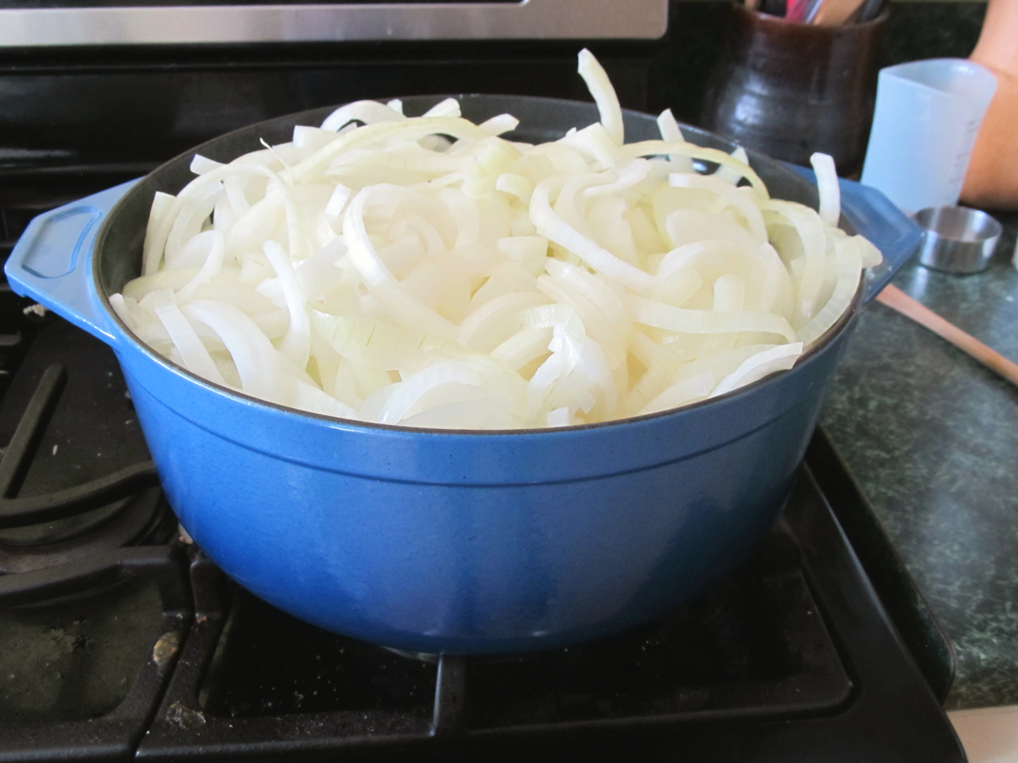 A couple quick notes on this recipe. First and foremost, it takes time. In order to get the awesome sweet flavor of the onions you need to cook them down and slowly cooking down 7-8 pounds of onions cannot be done in an hour, more like five. I know, I know, in the modern world everyone is used to getting things so FAST, who has time for slowly cooking down onions. Well suck it up. Trust me, this winter when you’re all cooped up you’ll have time. The real beauty of this slow cook method is you really don’t even need to stir the onions. Just let them cook. Go in the kitchen every hour or so and give them a quick stir but since they are releasing tons of liquid they won’t burn or stick. Trust me! There is very little active time for you here other than slicing up the onions.