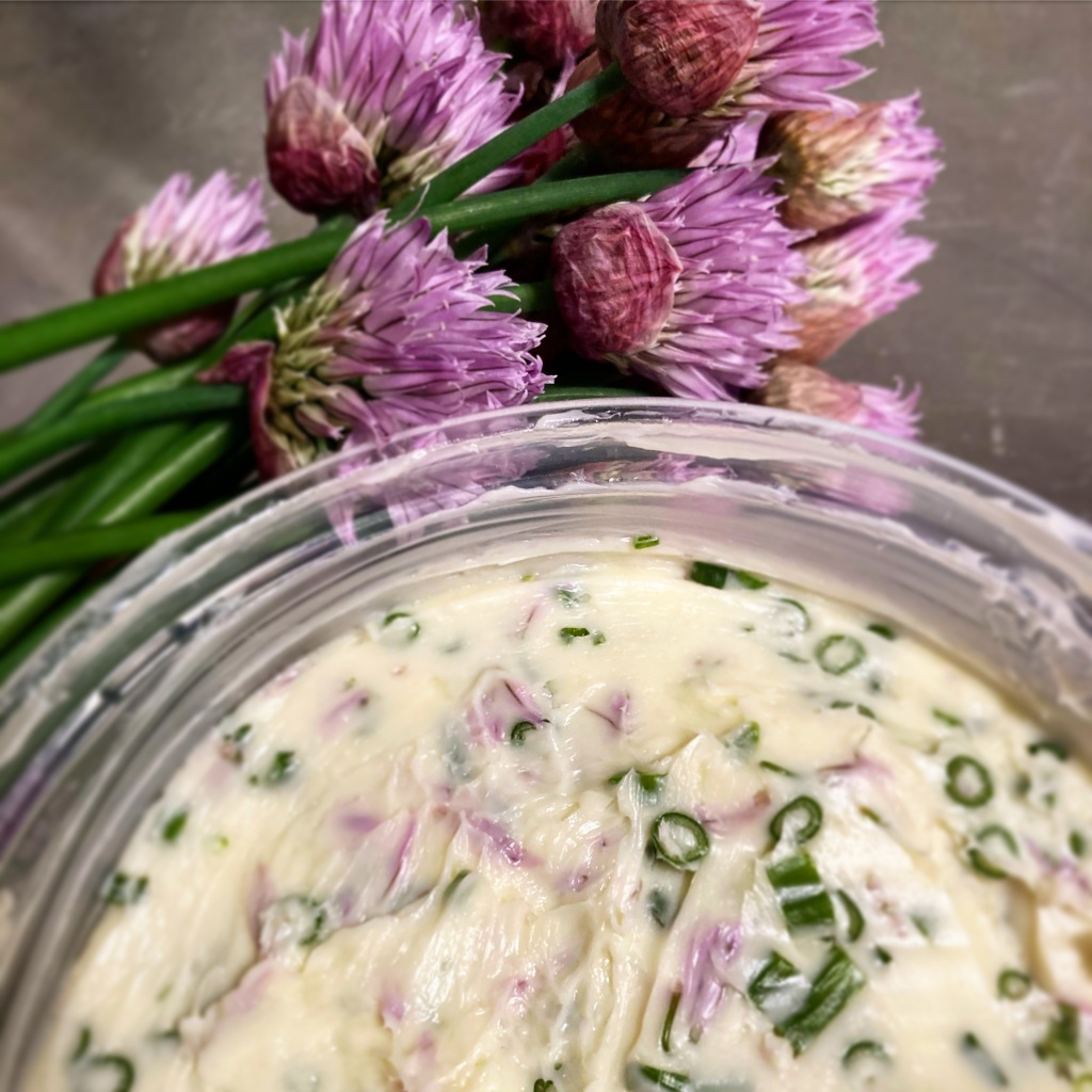 While sitting in the kitchen wondering what to do with the chive blossoms I spied the ramekin of butter we leave out in the counter. What, you don’t leave a little butter out on the counter so you can spread it easily on your toast? You should, but that’s beside the point.