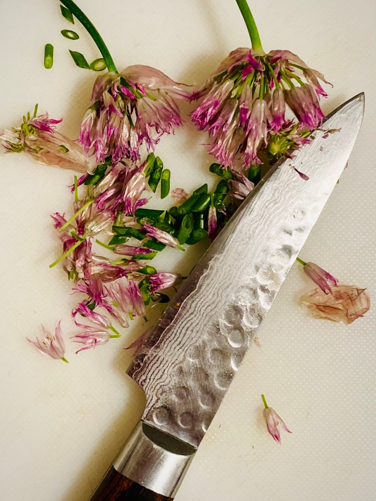 Right around Mother’s Day I picked up some chive blossoms at our local farmers market (Takoma Park on Sundays). Really nice flowers which are edible and very chive-y. Almost like raw onion if you eat too much of the blossom at once, a bit tannin-like. Pro-tip: don’t eat a whole blossom at once. Don’t say I never did anything for you!