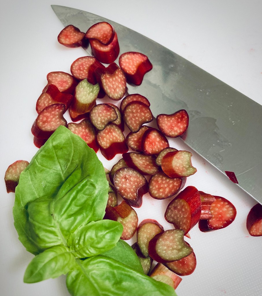 Pickled Rhubarb – the following ‘brine’ is good for 3-4 C of diced rhubarb. 1 C of apple cider vinegar, 1/2 C (125 gr) of granulated sugar, 3-4 sprigs of fresh thyme or basil leaves (both work nicely with rhubarb).